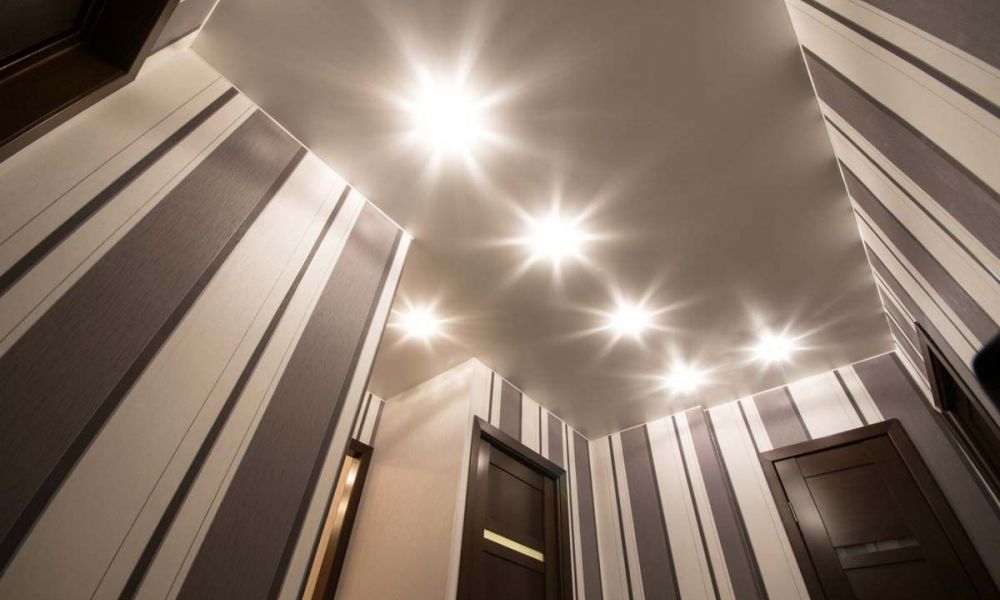 Какое бы освещение вы не выбрали, натяжной потолок в прихожую – это идеальное решение, поскольку он скроет под собой всю проводку, а вывести любое количество светильников проще и дешевле через натяжной потолок чем, например, гипсокартонный.